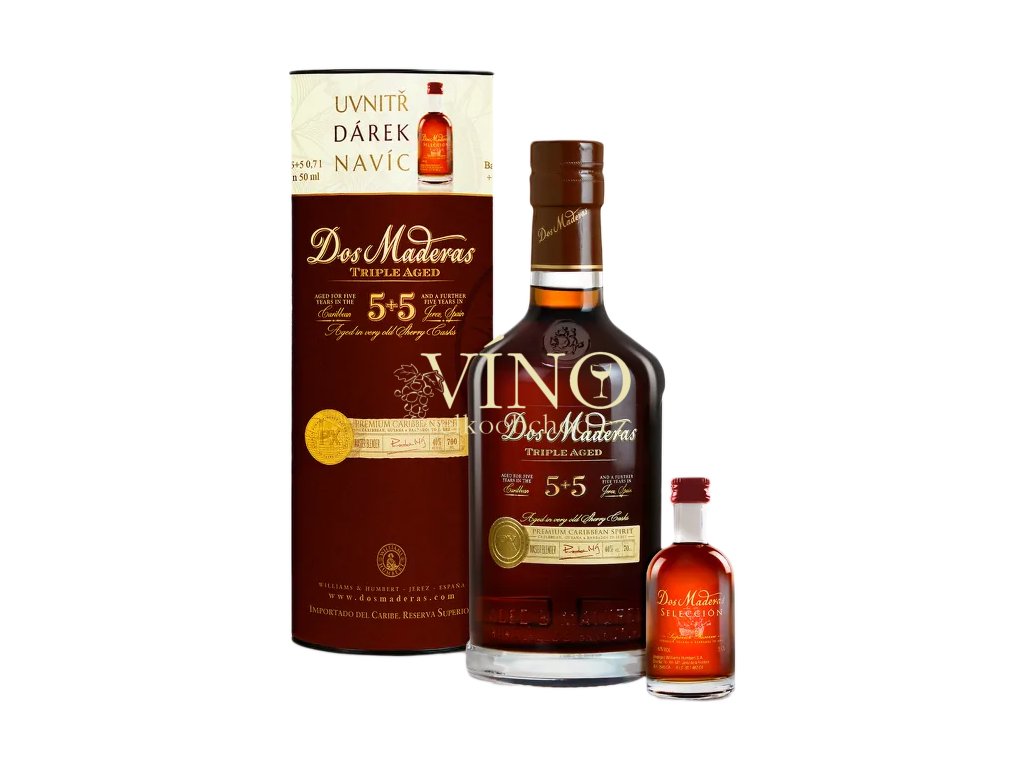 - Novinka, dárkové balení Dos Maderas s dárkem - Dos Maderas Seleccion 5 cl. Dos Maderas P.X. 5+5 je prémiový blend karibských rumů. Prvních 5 let zraje v dubových sudech přímo v Karibiku. Poté je převezen do Španělska, kde zraje ve sklepích vinařství Williams & Humbert. Nejdříve 3 roky v sudech po suchém sherry Dos Cortados a na závěr 2 roky v sudech po sladkém sherry Don Guido z odrůdy Pedro Ximénez. Dos Maderas 5+5 má harmonickou vůni s dotekem hrozinek a fíků. Chuť je velmi jemná, komplexní a hřejivá.
