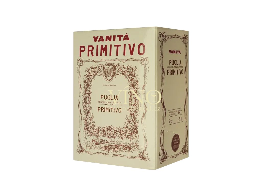 Varianta Bag-In-Box. Jde o moderní způsob balení vín pomocí vakuové technologie. V kartonové krabici je uložen plastový sáček s vínem opatřený ve spodu malým kohoutkem, kterým lze víno dávkovat. Po otevření nedochází ke kontaktu se vzduchem a načaté víno vydrží čerstvé i několik týdnů. Kvalitní červené víno z italského regionu Puglie, objem 5L. Víno je vyrobené z odrůdy Primitivo.