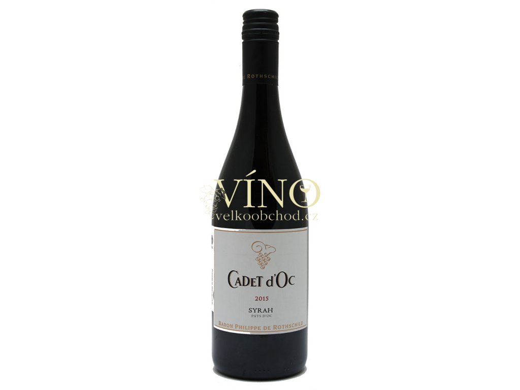 Cadet d´Oc Syrah Baron Philippe de Rothschild. Silné a kompaktní, elegantně kombinuje silní a jemné třísloviny. Cítit jsou velmi zralé černé třešně s nádechem švestek a dotekem koření nádechem koření. Archivace a optimální požitek :1 – 3 roky Doporučené harmonické spojení: s červenými masy s pečenou drůbeží s pernatou zvěřinou s tvrdými sýry Max. obsah alkoholu :13,5% Optimální teplota k servisu :14° C - 16° C