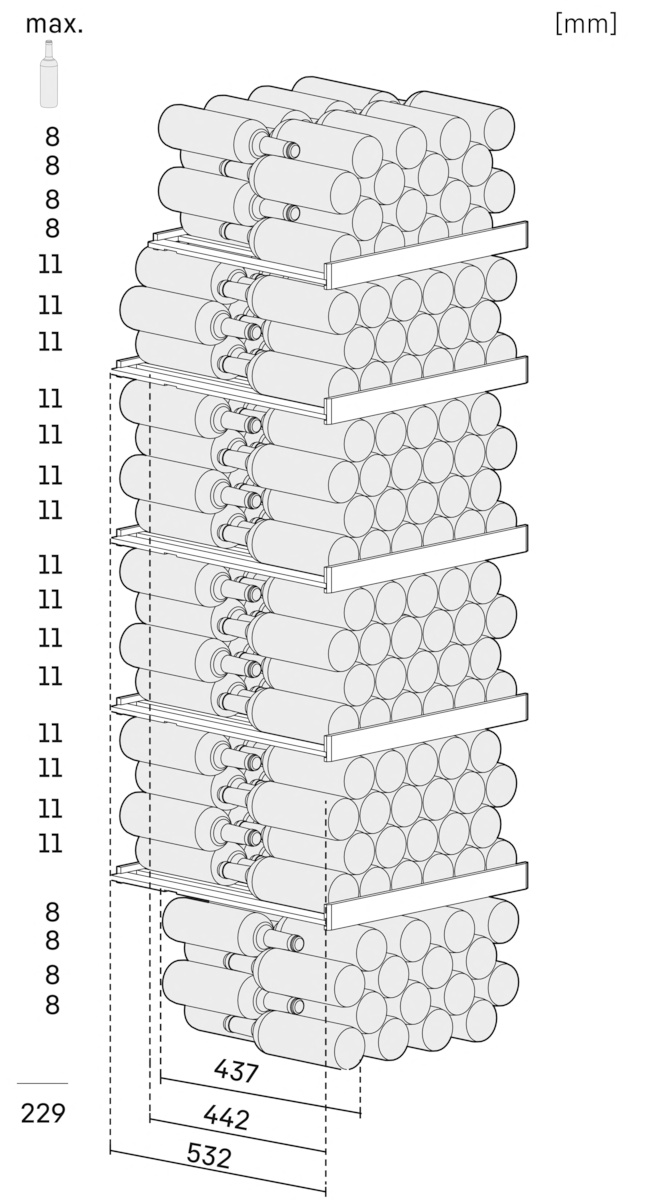 Promyšlené a propracované. Elegantní police vyrobené z bukového dřeva jsou navrženy pro vodorovné uložení vín bez působení vibrací a díky ergonomickému tvaru lze láhve snadno zasouvat, vytahovat i přeskládat. Další výhodou je skutečnost, že dřevo dýchá a dokáže uložit menší množství vody, což je dobré pro mikroklima uvnitř a tedy i pro dlouhodobé skladování.